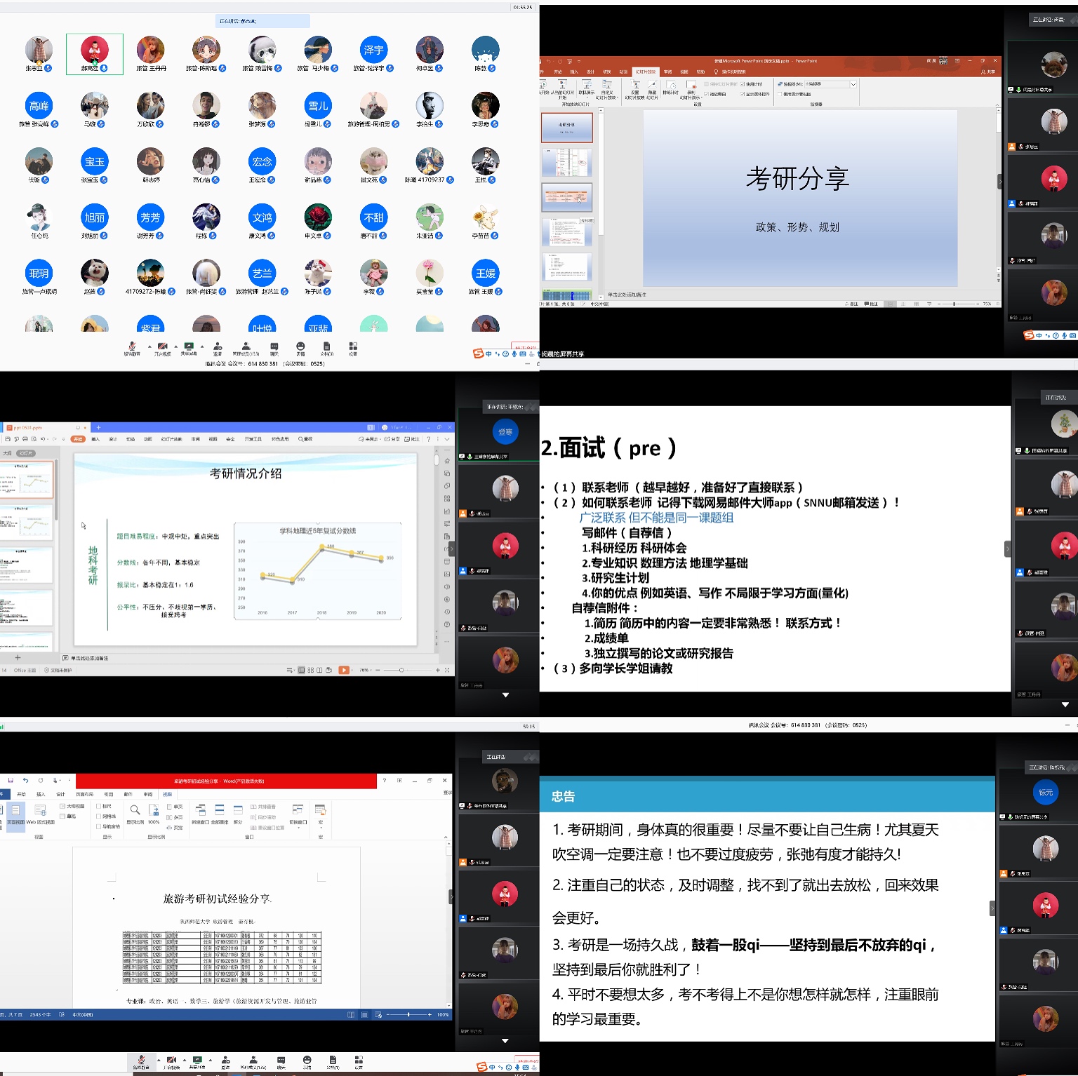会上,5位“上岸”员工代表分别就考生关注的择校、备考、复试等问题进行了深入细致地讲解,并结合自身考研经历、专业背景给学弟学妹们提供了宝贵经验与建议。其中,考取公司地信专业的闵晨同学结合地信专业的学科特点,从考研政策、考研形势、考研规划三个方面分享了自己的研路历程,他介绍了地信专业的必读书目、各科平均分以及时间规划等内容。王登寒同学来自2016级地理科学(创新实验班),成功考取公司学科教学(地理)专业,她从笔试的试题类型、逻辑框架、参考书目、学习计划等方面为同学们提供复习指导。陈铄元同学今年以优异的成绩考取中科院地环所,她谈到,考研最重要的就是控制自己的节奏,要保证平稳的心态和良好的精神状态,同时她分享了几个高效复习的APP软件。姜有根同学今年考取了公司旅游管理专业研究生,他针对各科目的复习内容、时间管理、单科技巧等内容分享了一些行之有效的学习方法。最后,成功推免到武汉大学地信专业的田婧怡同学综合介绍了笔试、面试、机试各环节内容,同时强调了推免过程中细节的重要性。