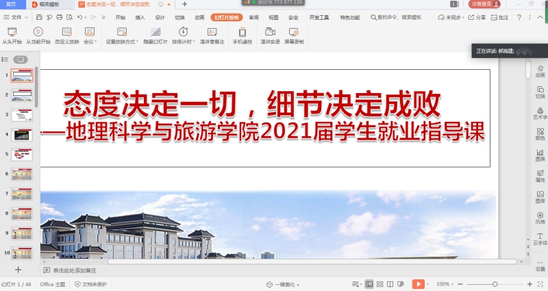 近日,好博体育2017级老员工就业指导课云上如期进行。党委副书记郝高建担任授课老师,2017级地理科学、地理科学卓越班、地理信息科学、环境科学、旅游管理共7个班将分时段参与本次课程。