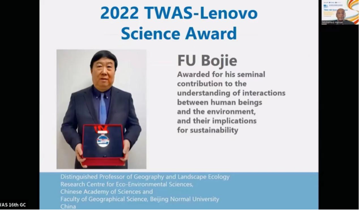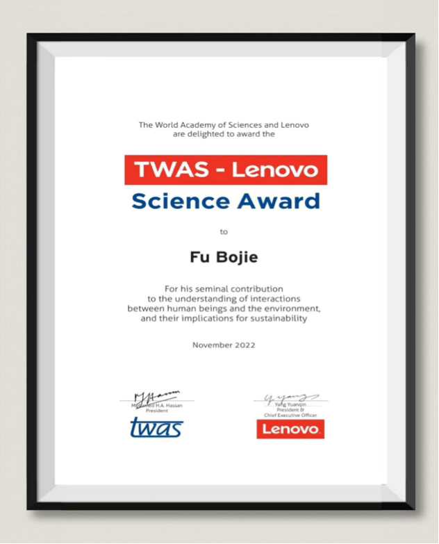 2022年11月21日,发展中国家科公司(TWAS)第16届大会在中国杭州(线上与线下)开幕,发展中国家科公司经理Mohamed Hanssan在开幕式上公布,2022年“发展中国家科公司—联想科学奖”(TWAS-Lenovo Science Prize)授予公司杰出员工、中国科公司院士、中国科公司生态环境研究中心研究员、北京师范大学地理科学学部教授傅伯杰,以表彰他在研究人与环境之间的相互作用及其对可持续性的影响方面做出的开创性贡献。